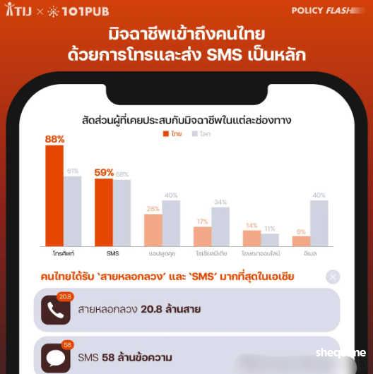 上述数据反映出,泰国的电信网络诈骗问题较为严峻,且对国家经济造成了严重损害。进一步了解后发现,泰国的电信诈骗损失最严重的类型分别是投资骗局(40%)、威胁恐吓(12.8%)、高薪招聘(11.8%)等。且通过电话进行的诈骗最多,去年泰国人收到的诈骗电话和短信为亚洲最多,大约88%的泰国人接到过诈骗电话,高于全球61%的水平。