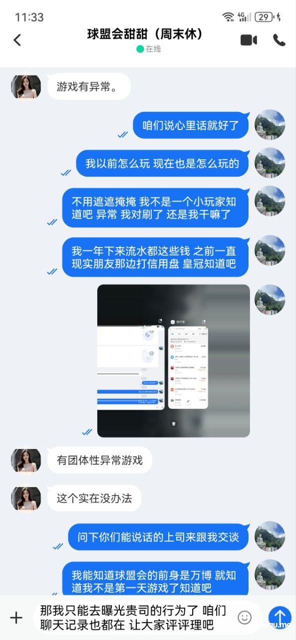 几年前套着亚博的名字 后面更名为球盟会,多年以来一直在这个平台玩 这几天输麻木了所以注册了新号在这边继续开始,没有做代理线,不存在任何套利行为,试问我一个输了千百万的人需要做这种事?估摸着改改运 秉承着老玩家有始有终的态度 所以没有任何防备 还是跟以往大手大脚的下注情况一样 毫无疑问 上来还是以往大手大脚的下注方式 这次充了大概有7~8万,账户负盈利,昨晚8点多提现了两万,提现一直没有审核,今天账户还有22400,官方一问的态度就是让等游戏平台方审核,之前虽然也有过审核经历,但是没有这么离谱这么久,这次算是认栽了,账户里面里外里5万块钱,吃相就这么难看,在你们这大号都v12了 不知道是不是主管中饱私囊,贵司难道没有高层领导在管事吗?寒了老玩家的心,属实了,希望出面与我交涉,否则支付宝商户包括手底下跑分这些卡投诉到底,真是搞不懂,一个稳定的玩家,你们黑这点钱 不够我一个月的流水,这是何必?编理由也编的高级一点 什么叫团队对刷流水 真牵强 说出去都笑死人 你不如直接说我们只提供娱乐 出款是违法的赌博行为 这样不是更好吗?你家对刷吃蚊子肉对刷吗?那还真的是亏得裤子都不剩了吧 我是玩家 不操心这些 但是黑钱就是你们的不对了 挂着亚博的皮,干的都是人事吗?