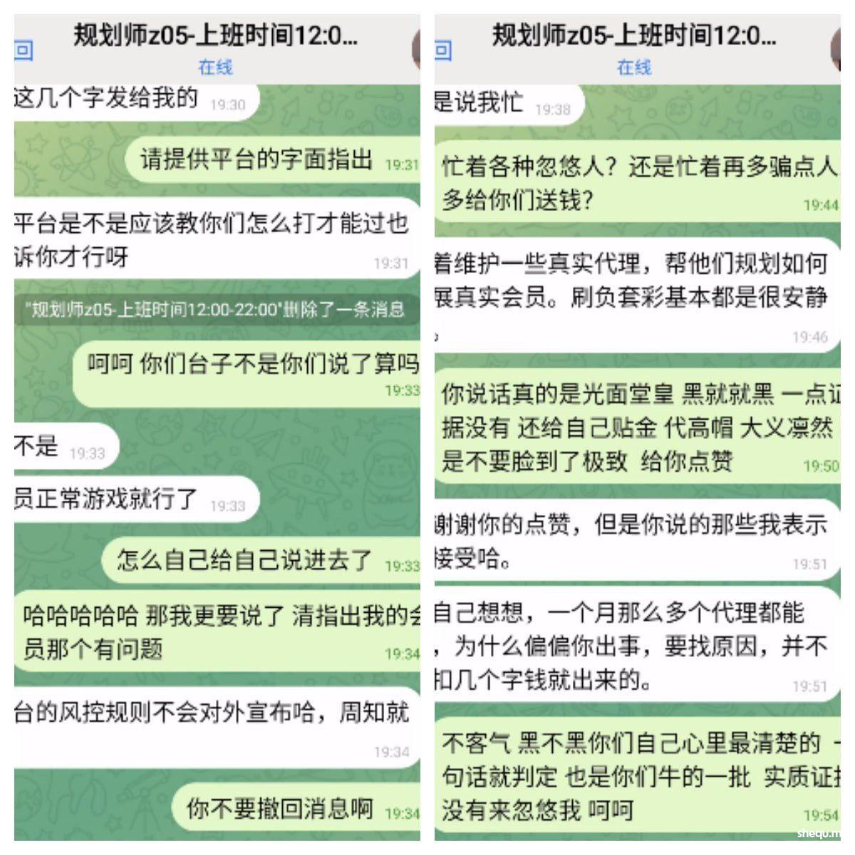 问他什么原因,说不出来,首先开始给你说让你提供会员发展证明,那么好我上传给他们聊天沟通截图,然后给你说让你提供录屏,好我录屏也提供了就让你等,一直拖到月中了我去问,又忽悠你说这才月中佣金还没有结束,上报老板在审核了,然后给你说5大联赛开始了让我继续维持会员保持活跃,这样好通过,好我也一直在维持会员,会员也一直在玩,8月又输了5W多负盈利,最后到现在我看他是实在圆不下去了