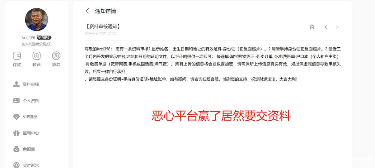 全面扩大了网络赌博这一夕阳行业日薄西山,杀人诈骗的本质。新号krzl398,充值10万玩百家乐,20万流水就赢了5万,提款直接交资料审核,1小时后直接黑款封号,黑款理由是:【刷负刷子】存款账户无关联,IP地址无关联,设备无关联,提款地址无关联,银行卡无关联,全部都是干净的,没有对打,你跟我说我刷负,好家伙直接新花样,输钱可以赢钱各种扣帽子,10万流水输7万屁话没有,20万流水赢5万黑款封号,彩,实在是彩! 百家乐也能作为刷负手段?有无对打20万流水你方查不出来?刷负开新号刷负?你方有无智商?是你们在秀下限还是我在秀下限? 【九游体育】作为杀猪盘这是无可阻挡、无可违逆的,玩家只能输不能赢,只要赢了就是交资料,黑款禁用,输钱什么措施也没有,这完全就是杀猪盘,这边强烈建议推出行业去缅北更有发展前途。请各位玩家代理远离杀猪盘,避免损失!